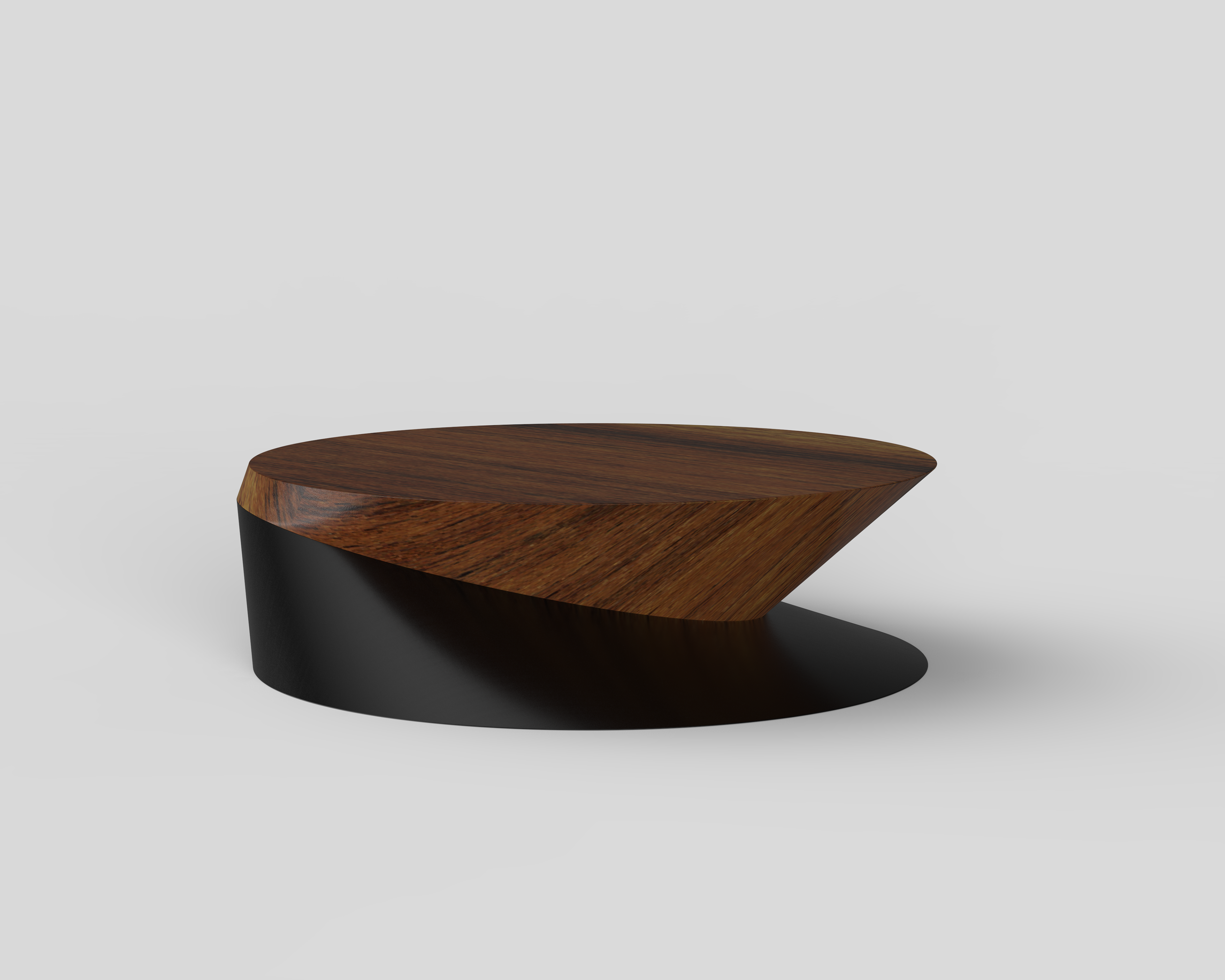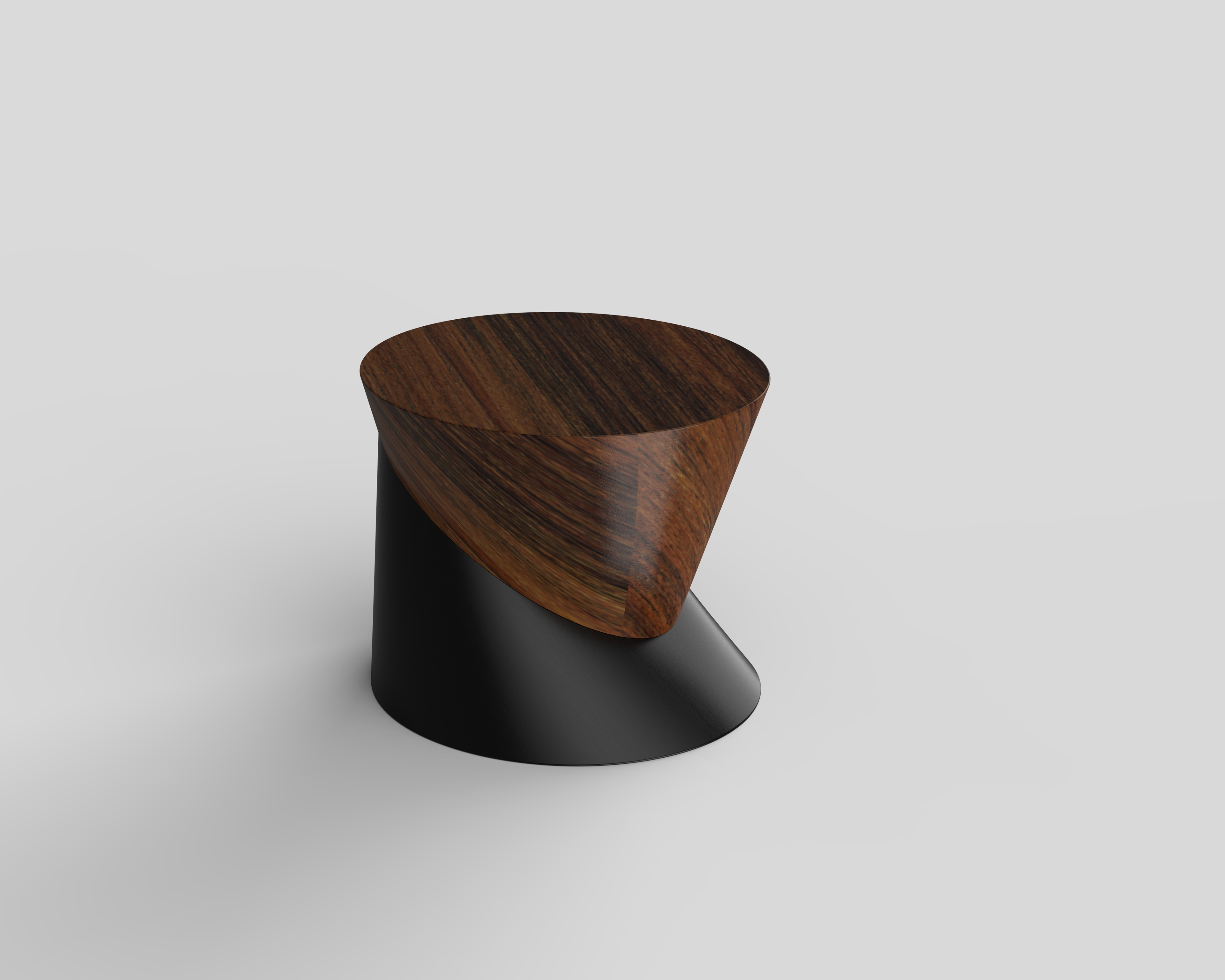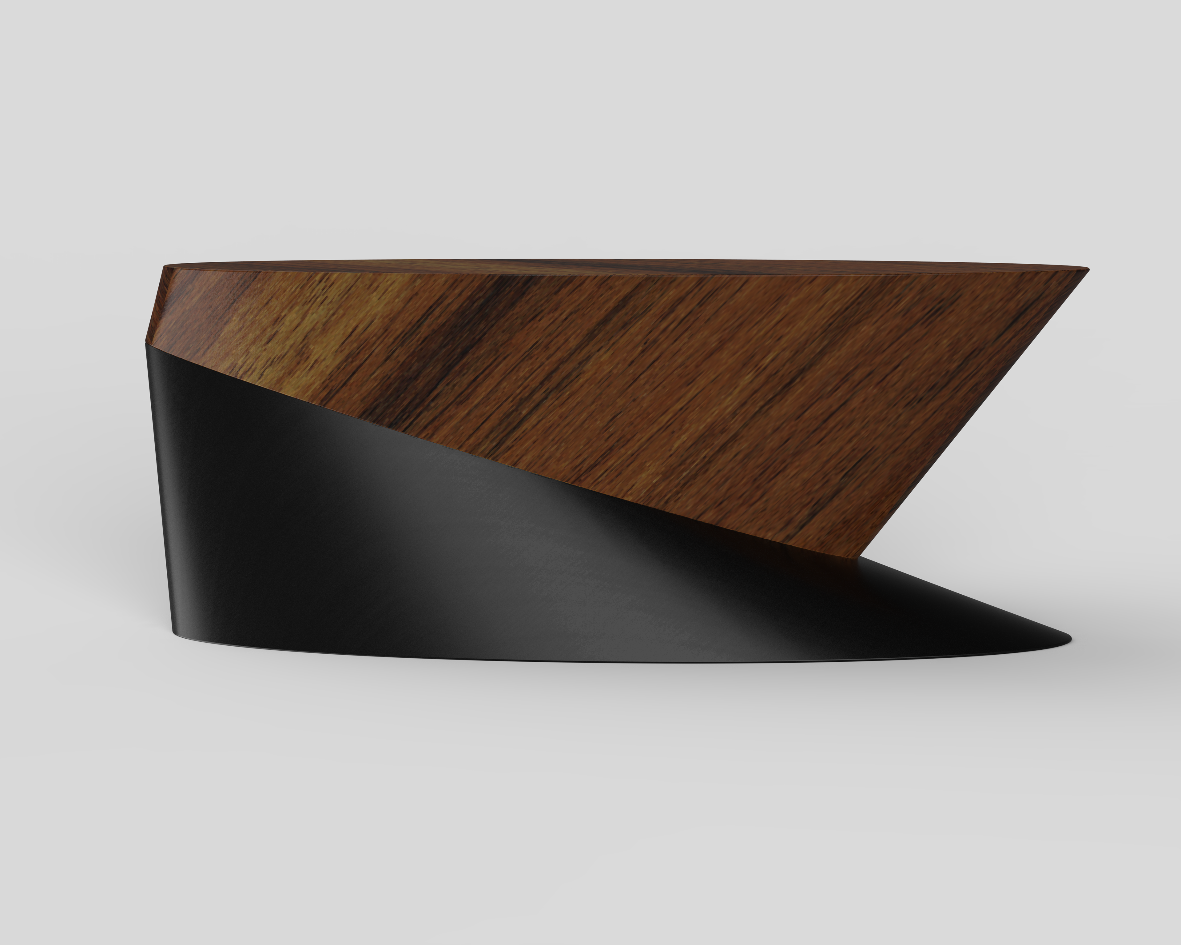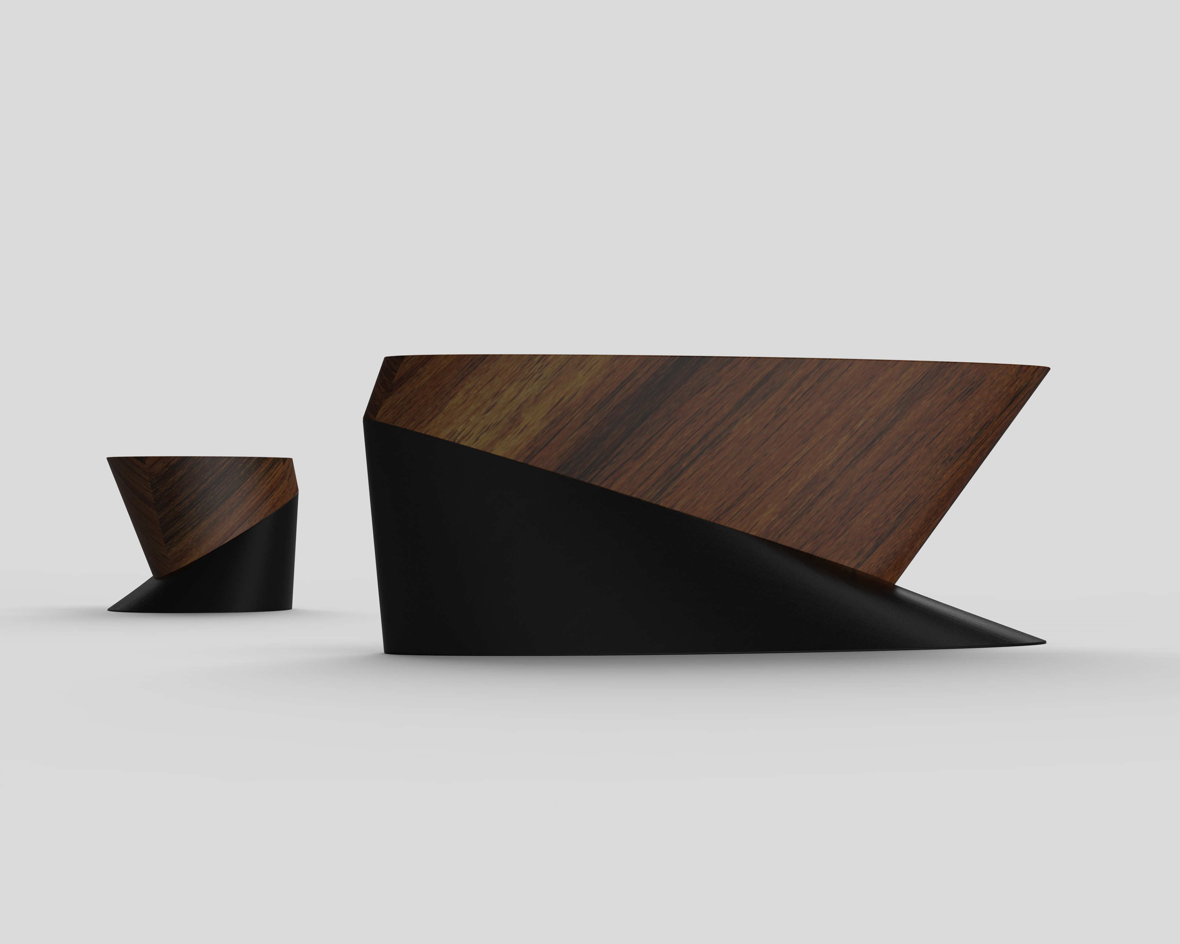 An exploration in material and proportion. The idea of capturing motion in a still object through dramatic angles and deliberate cut lines. The top is veneered walnut, and the base is dark chrome.