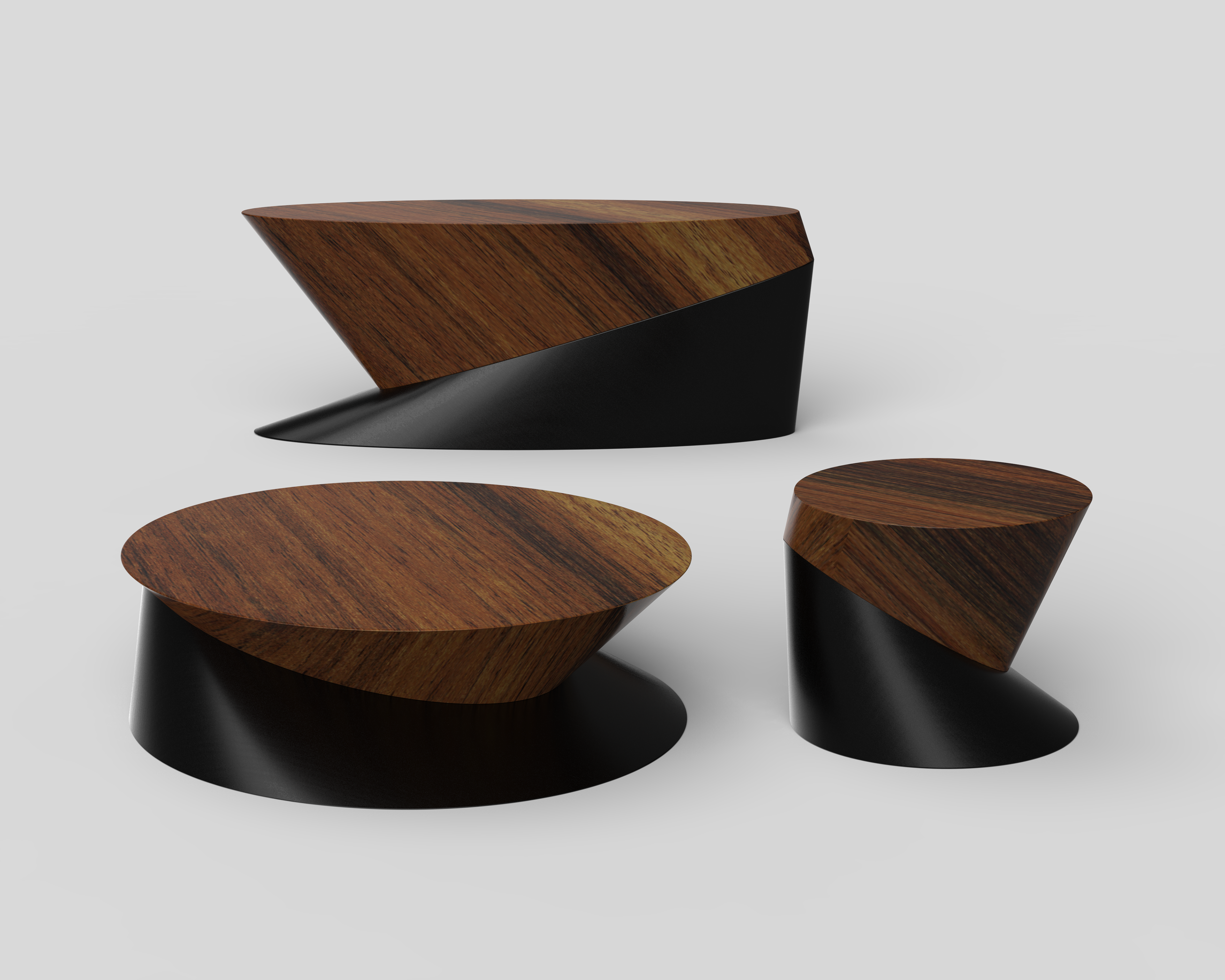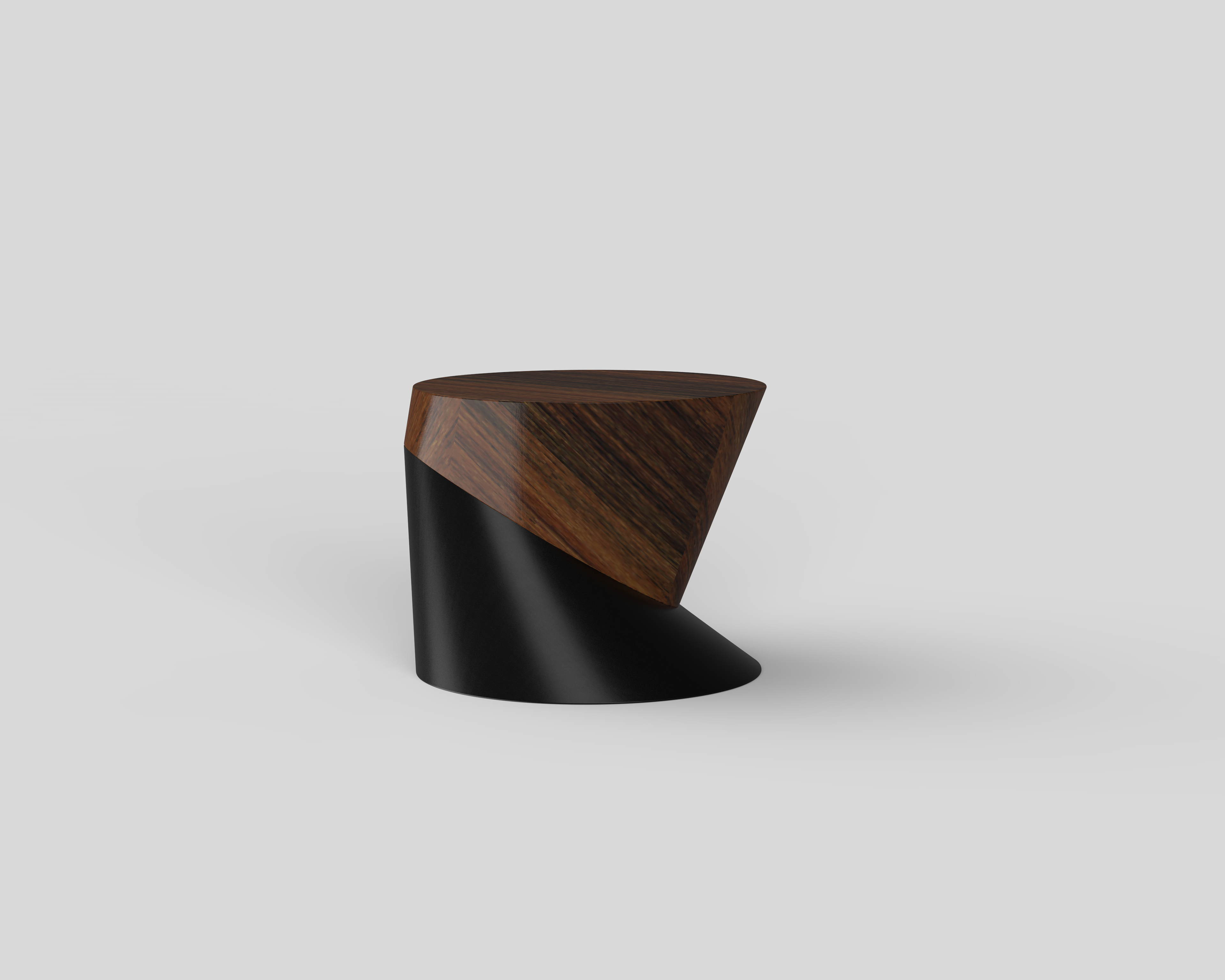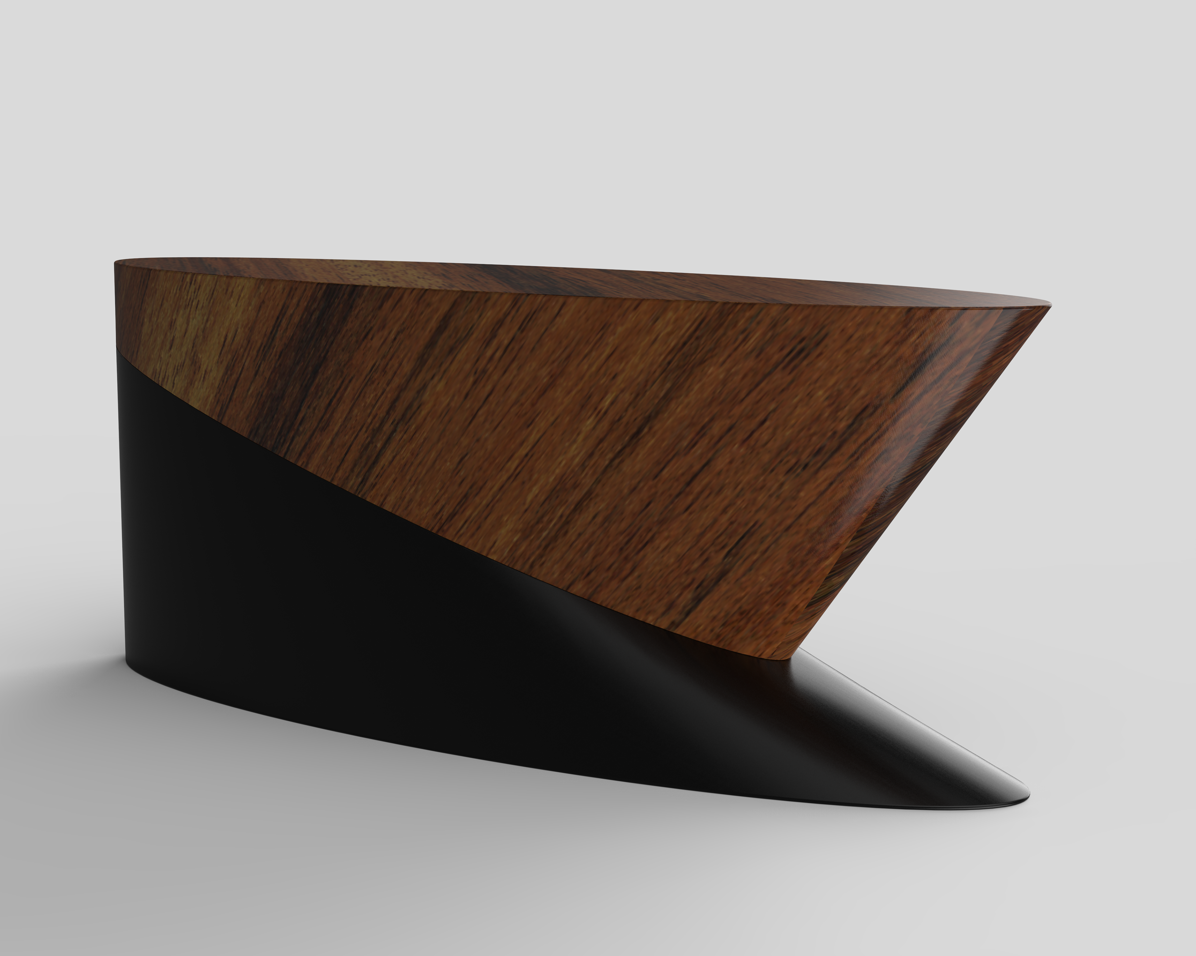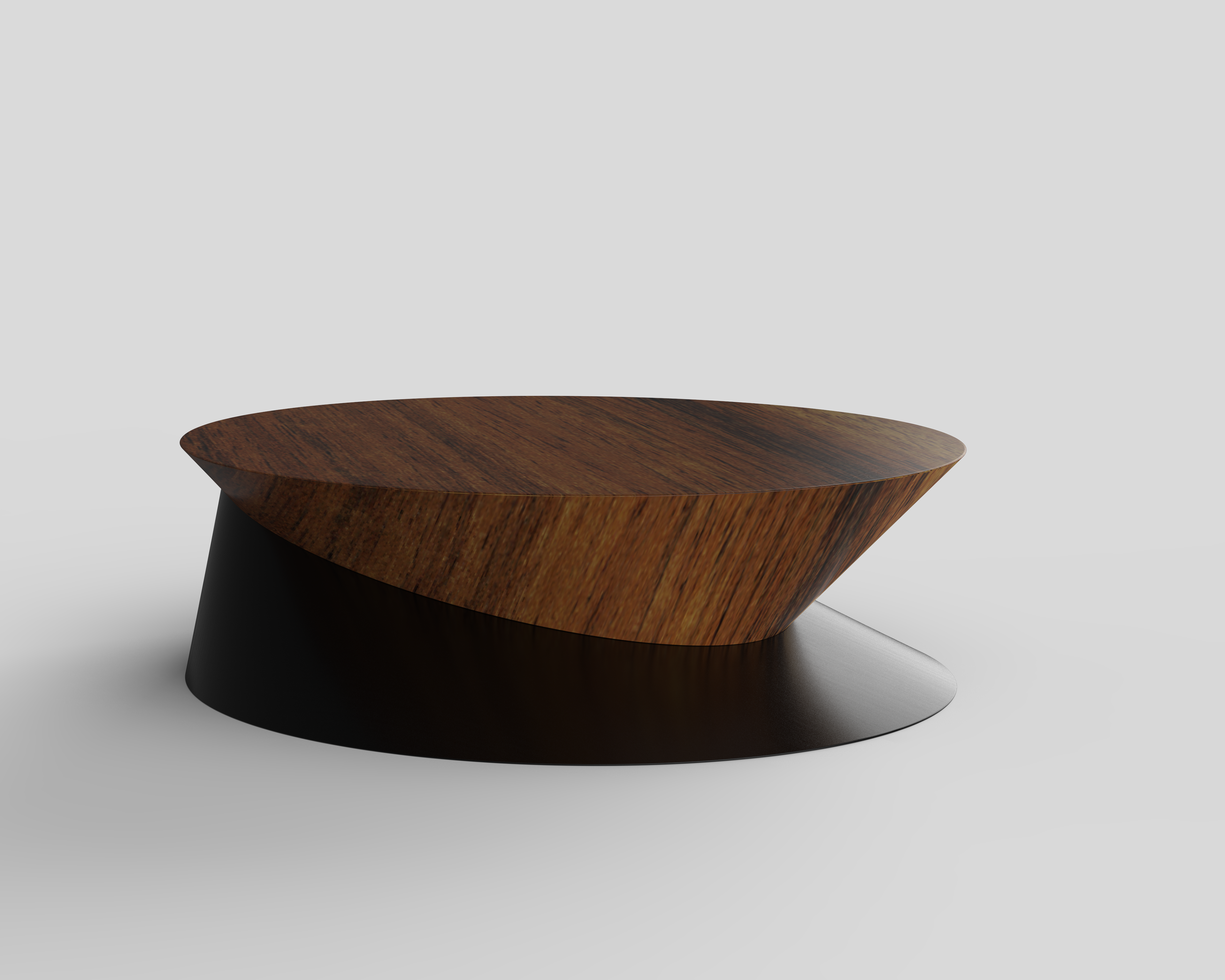 An exploration in material and proportion. The idea of capturing motion in a still object through dramatic angles and deliberate cut lines. The top is veneered walnut, and the base is dark chrome.