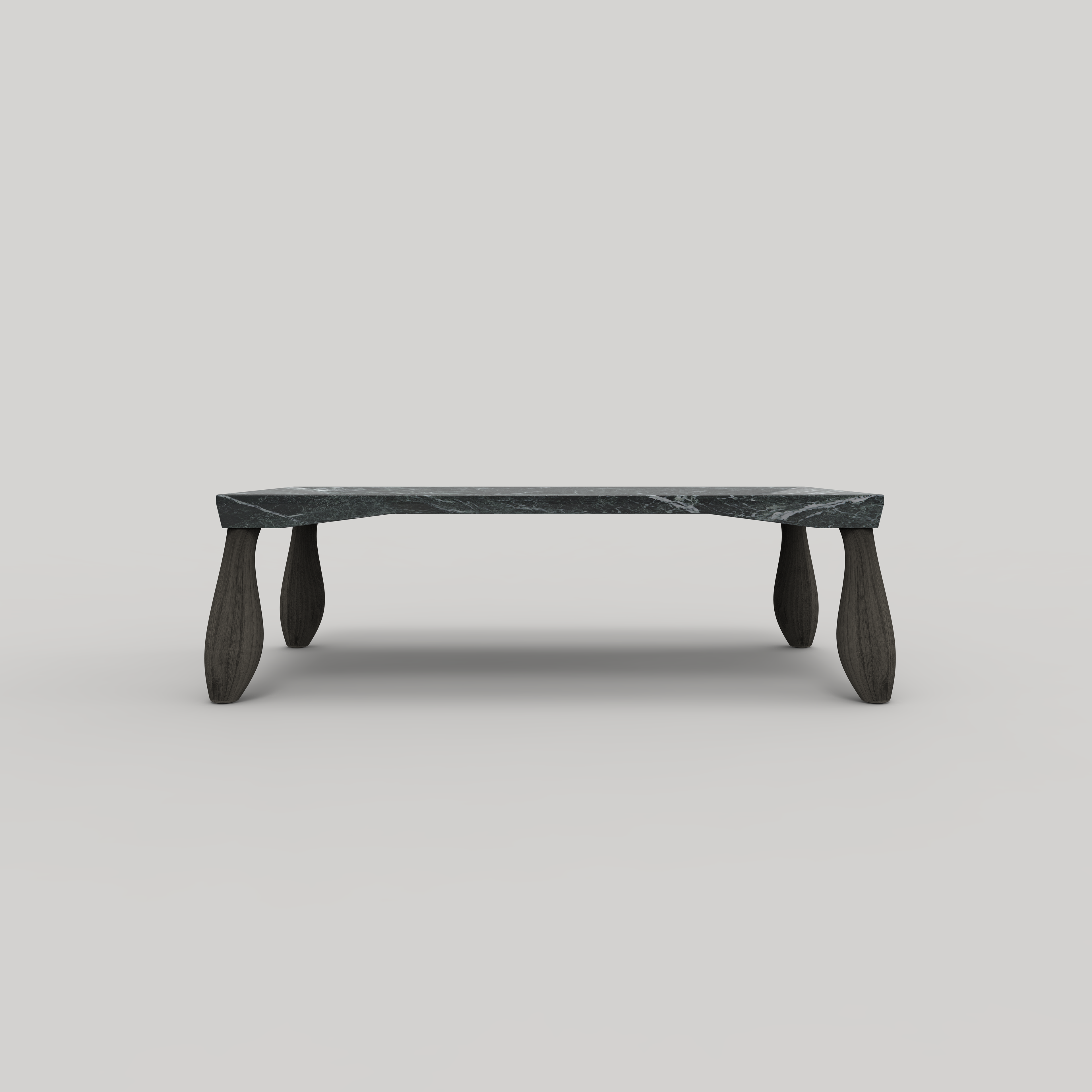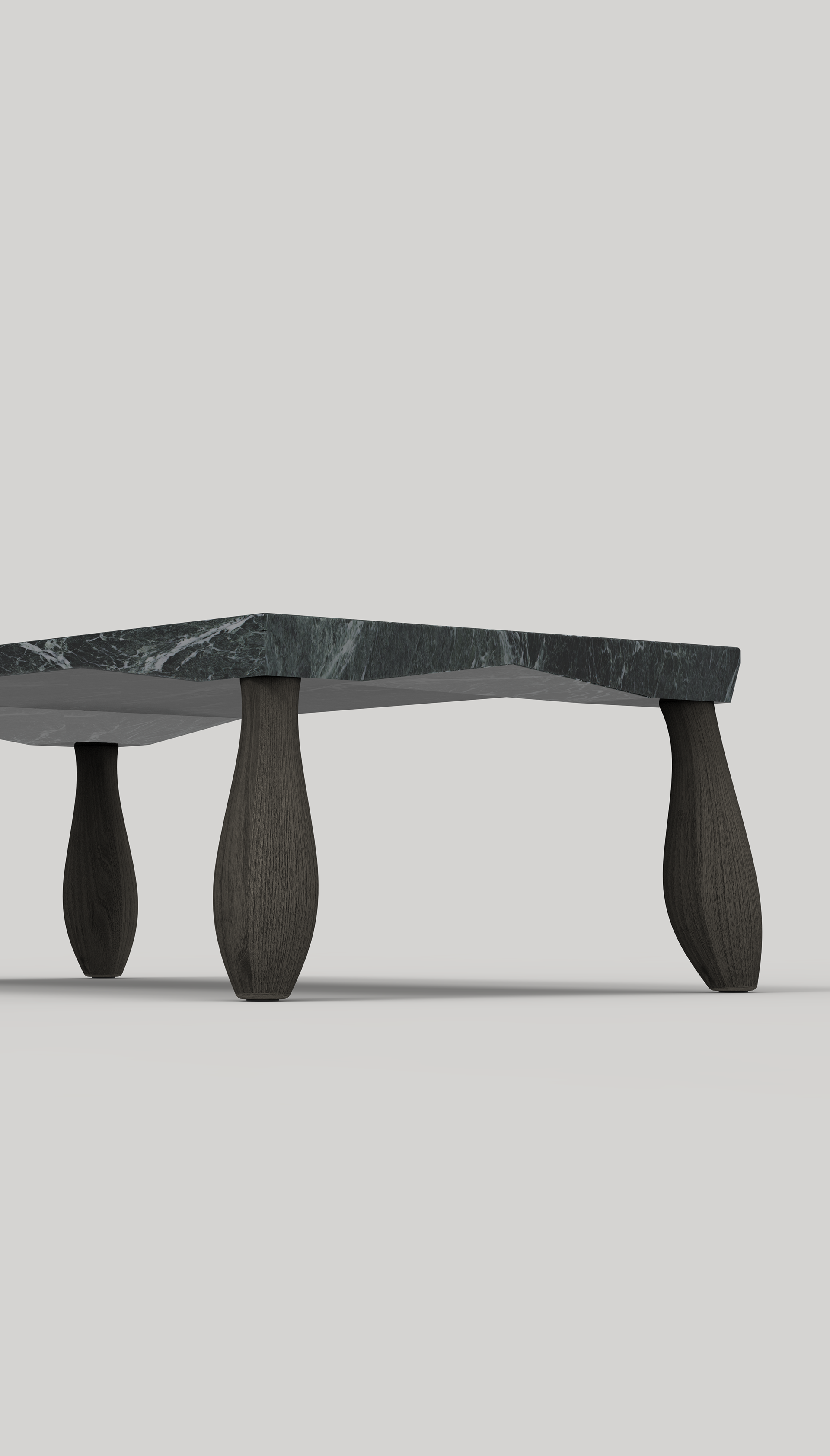 A balancing act of rigid flat cut marble and flowing turned wood.
