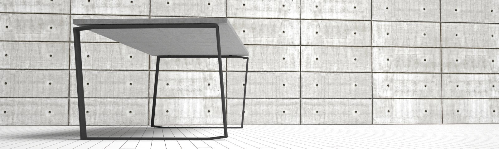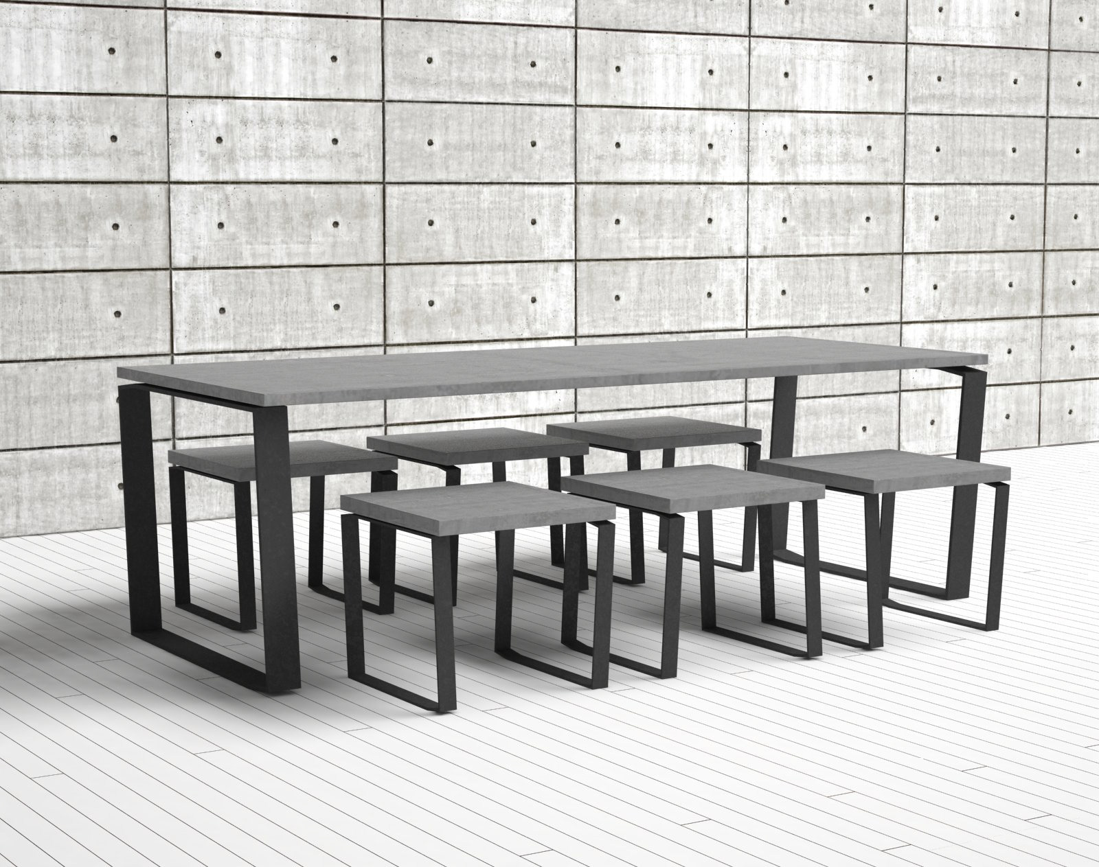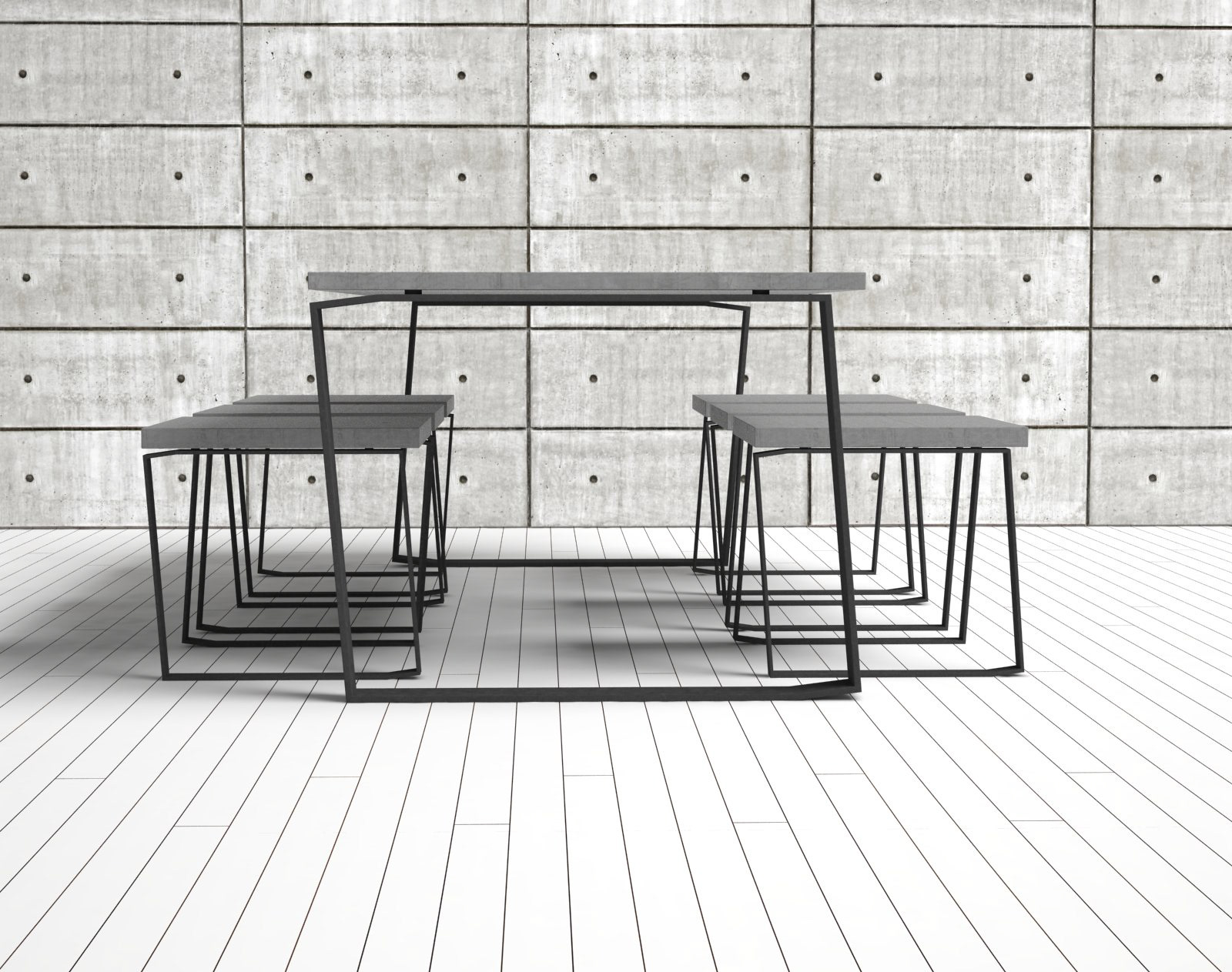 Harmoniously imbalanced design. A slightly askew dining table and backless chairs that have subtle detailing that suggests an imbalanced form. Upon further analysis, one sees that the form is, in fact, balanced, and a certain level of appreciation is achieved. The legs are formed from cold-tempered blackened steel, and the tops are slabs of a specially poured concrete. We have developed a lightweight hybrid concrete by mixing in fiberglass and mixing at a high speed to add air to the consistency (think whipped cream). The material is cutting edge and called GRC (Glass Reinforced Concrete). Dimensions are 84x42x30"h for the dining table and 24x22x18.5"h for the backless chairs.