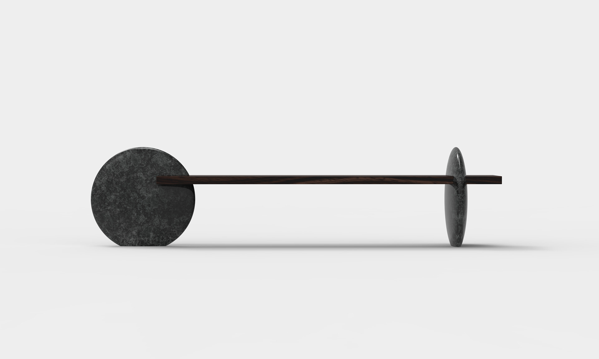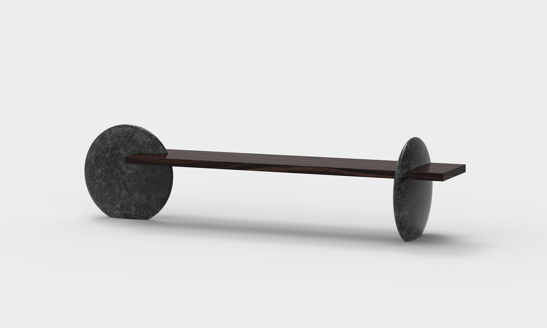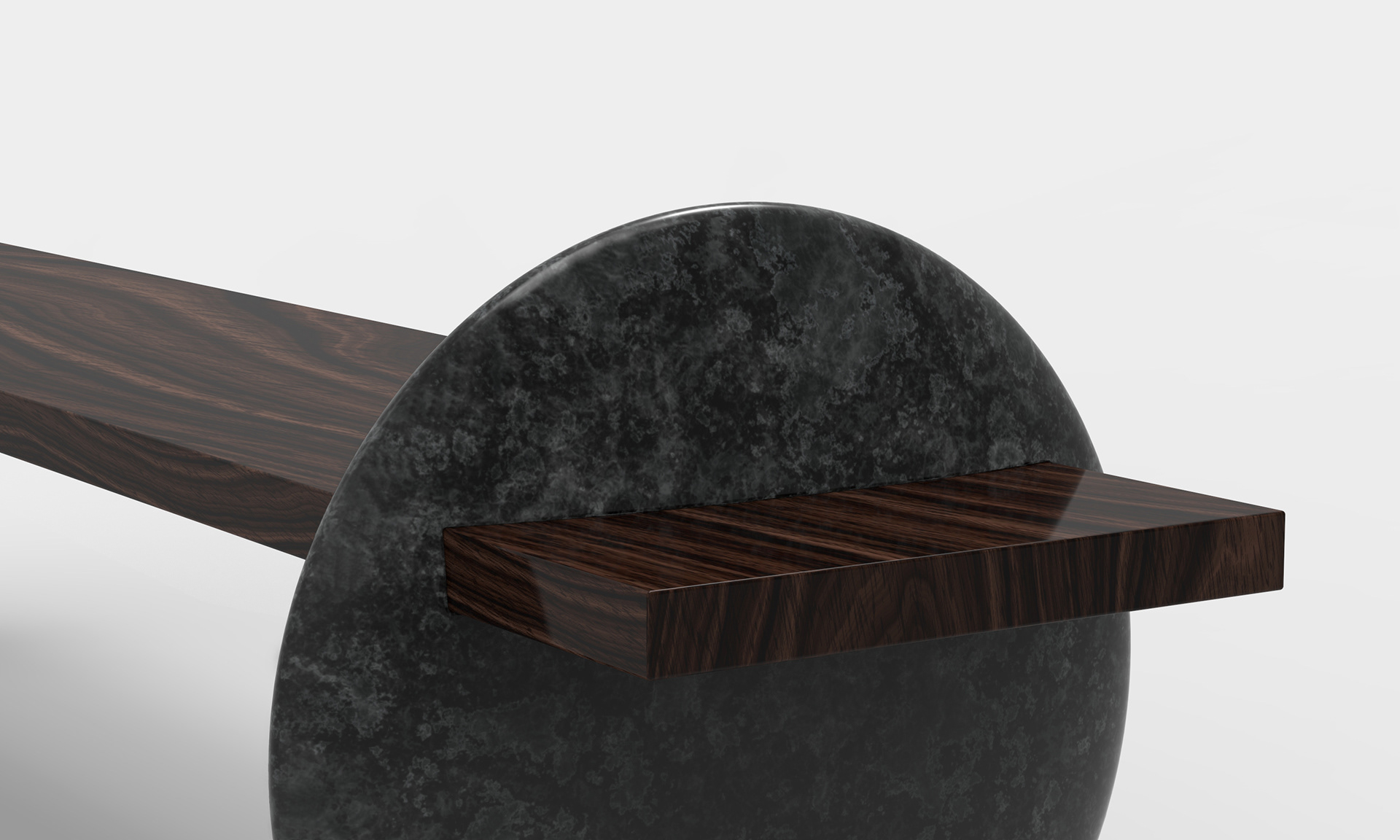 Monolithic and balanced forms in perfect harmony create a simple yet elegant design. Glossy black walnut is clamped to and bisected by polished black granite orbs. The bench is seven feet long, as shown, but can be customized as the client sees fit.