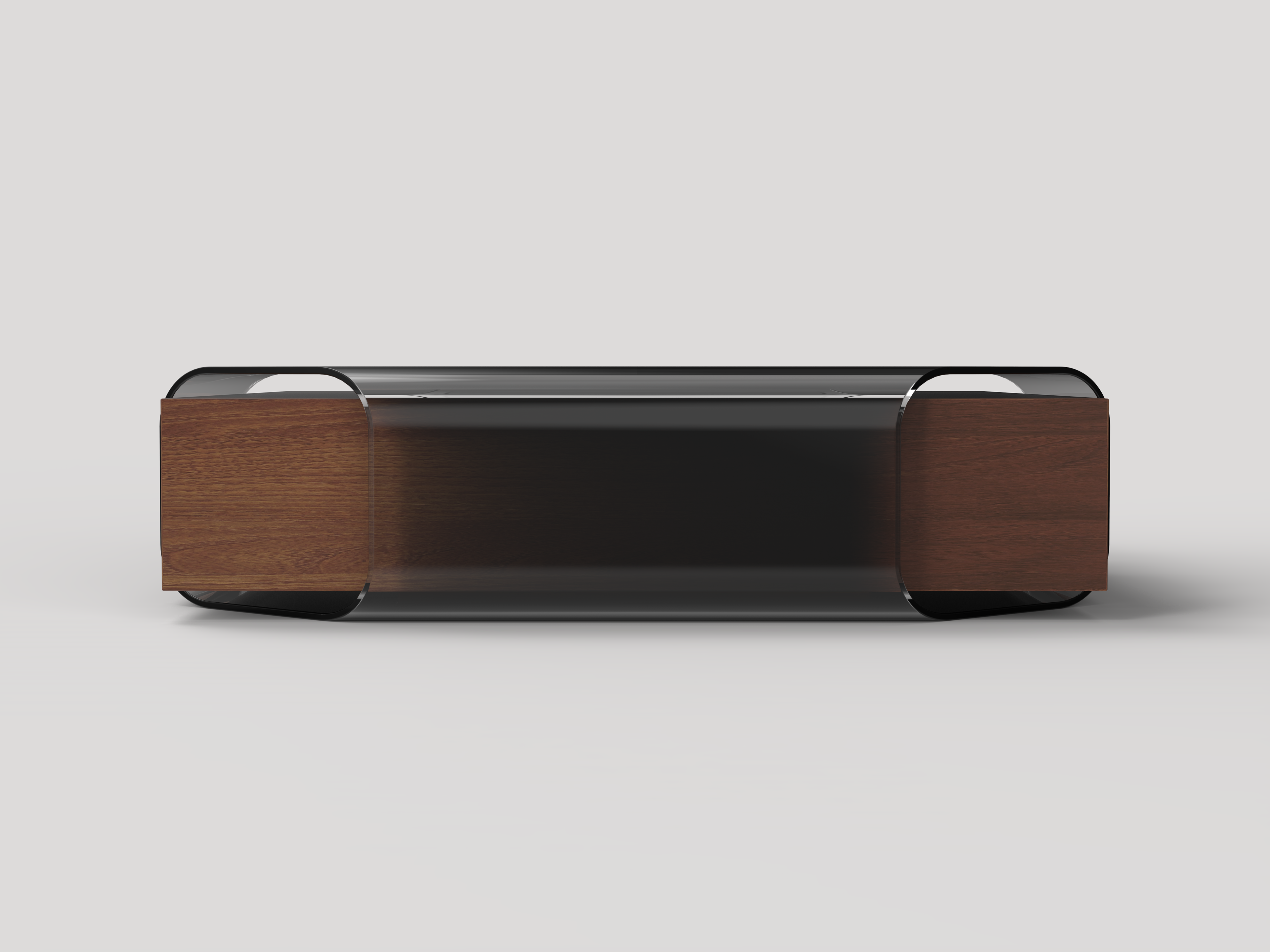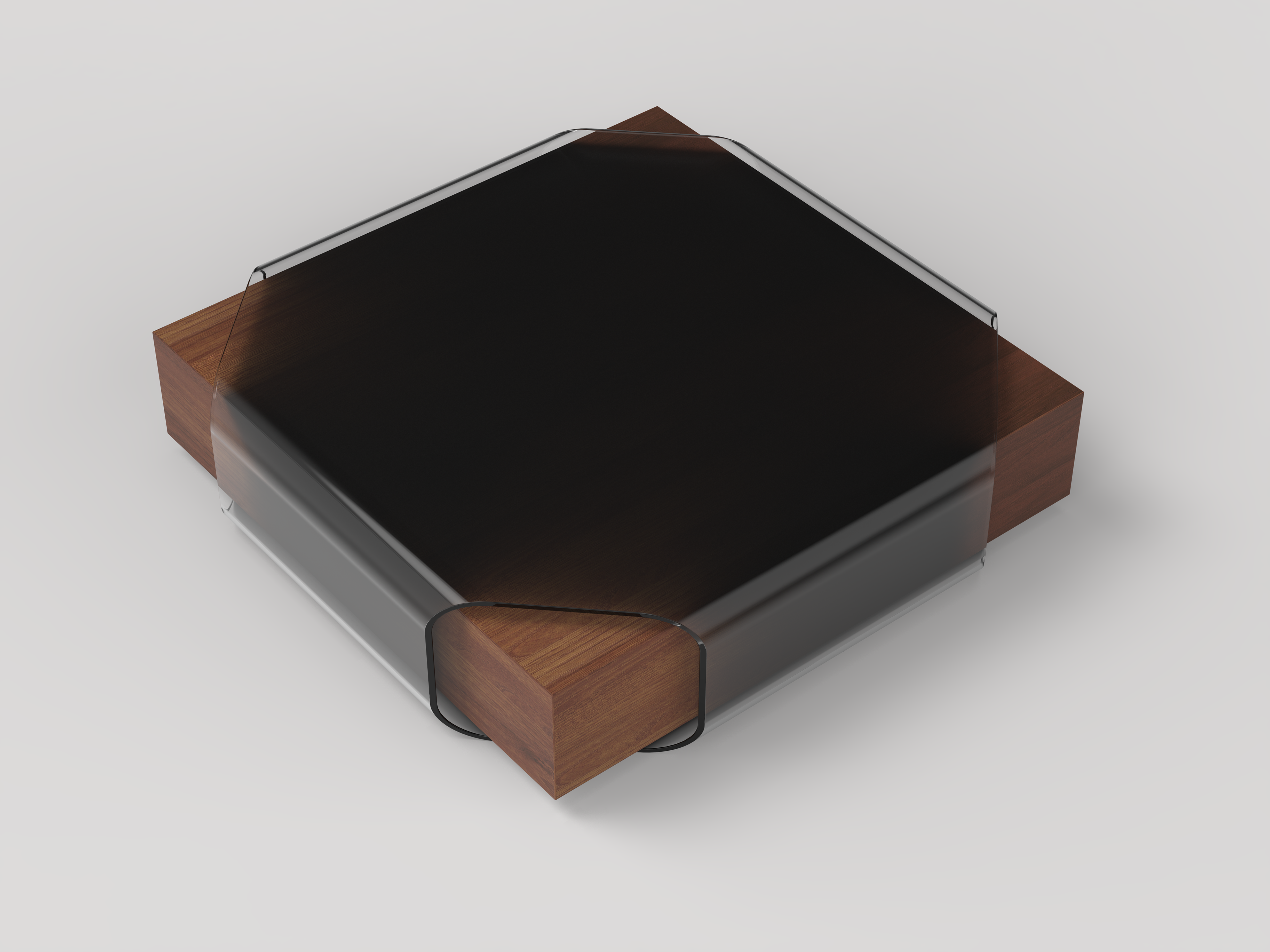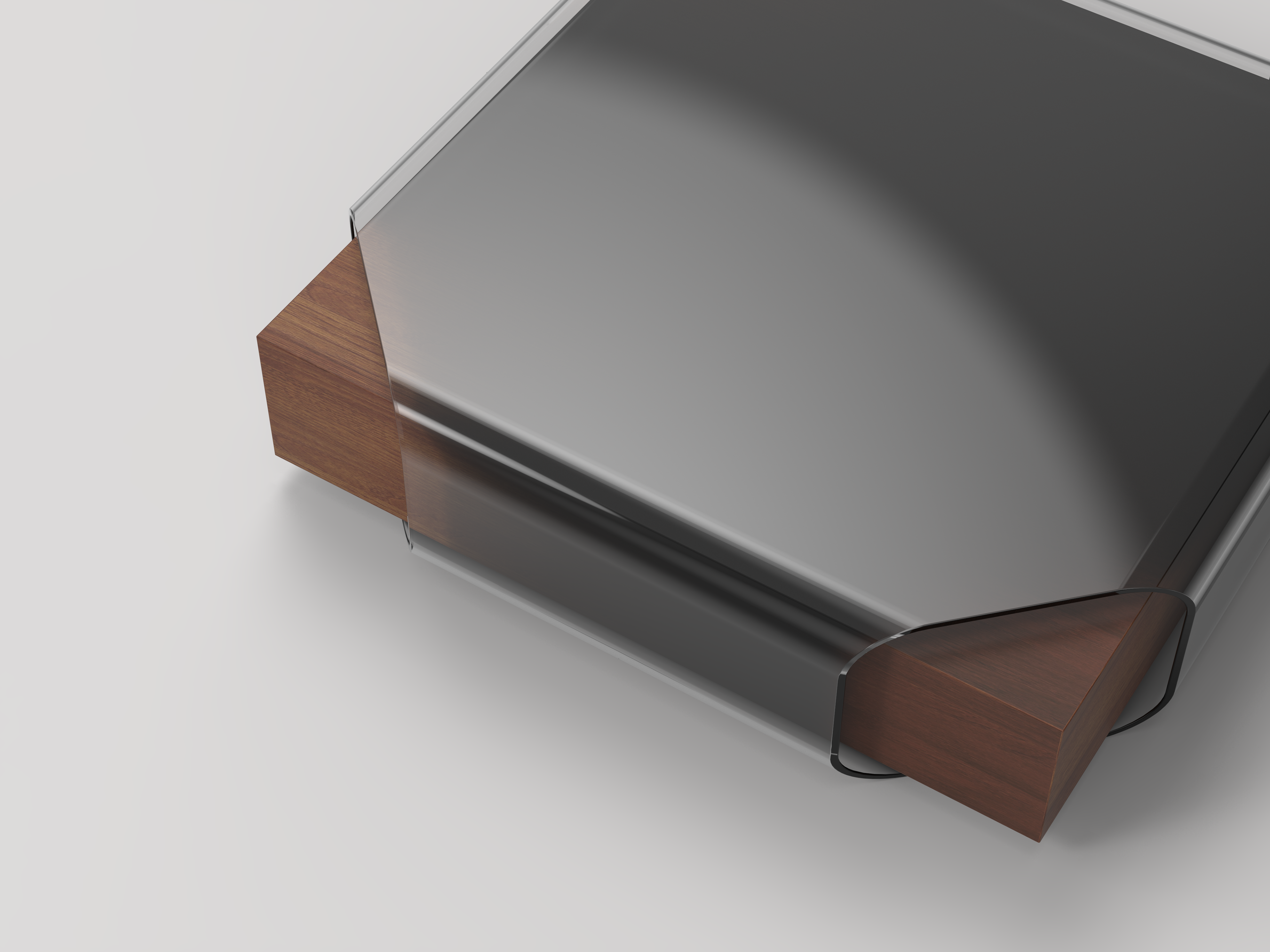 A large sheet of glass envelops a rectangular wooden base in this modern coffee table that explores form and material.