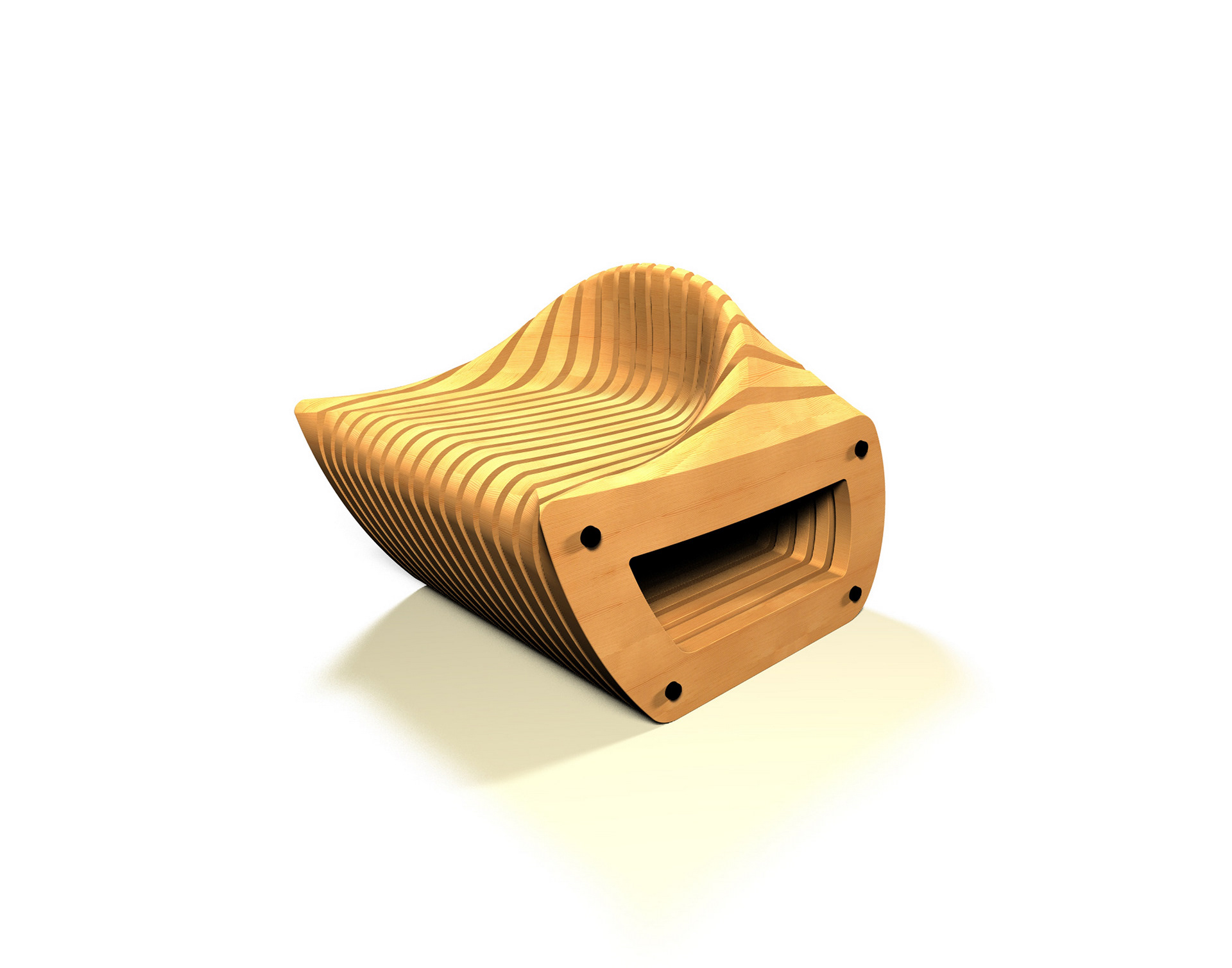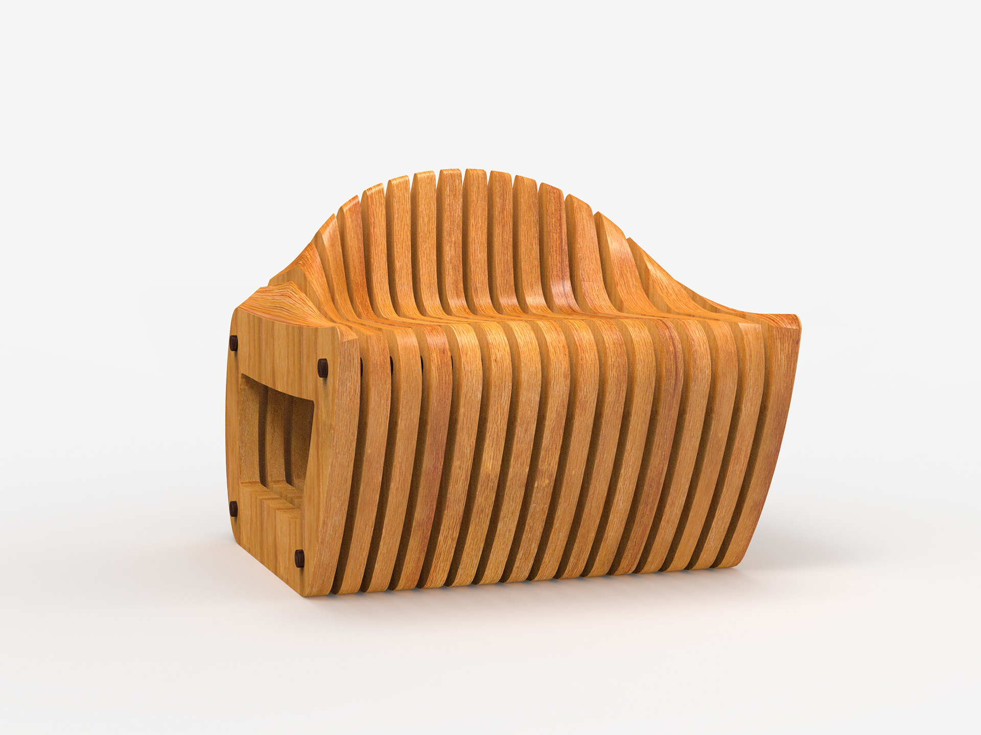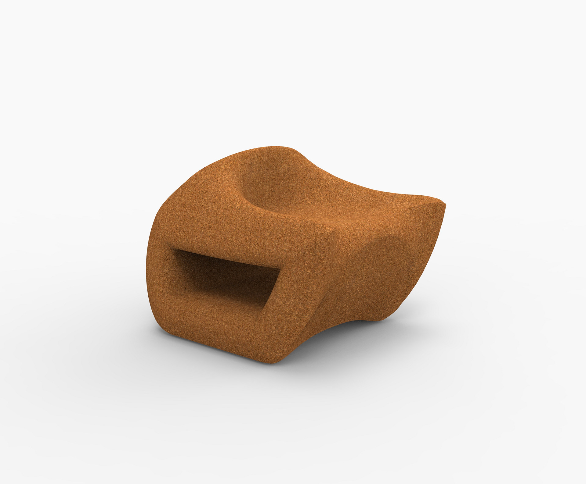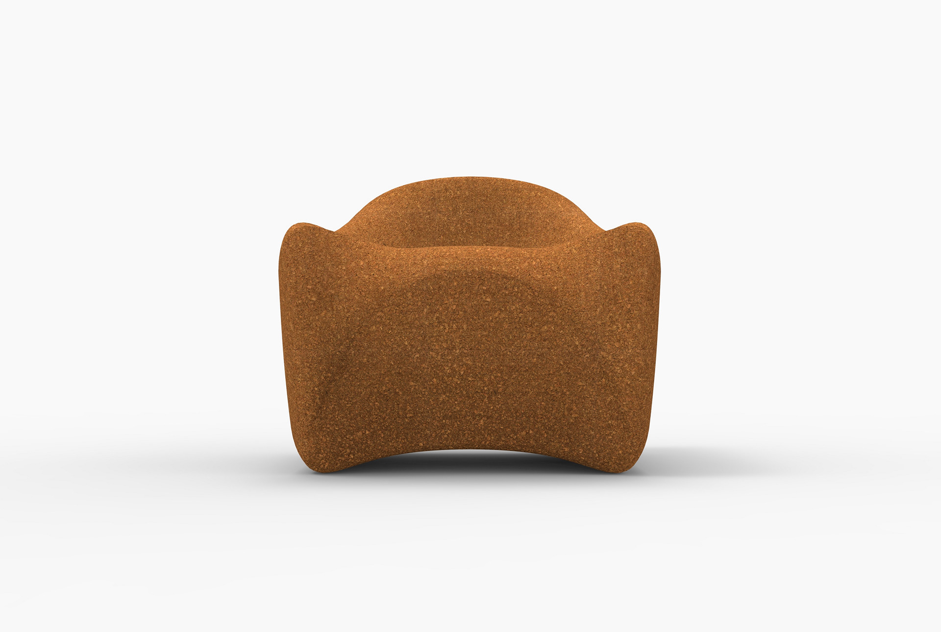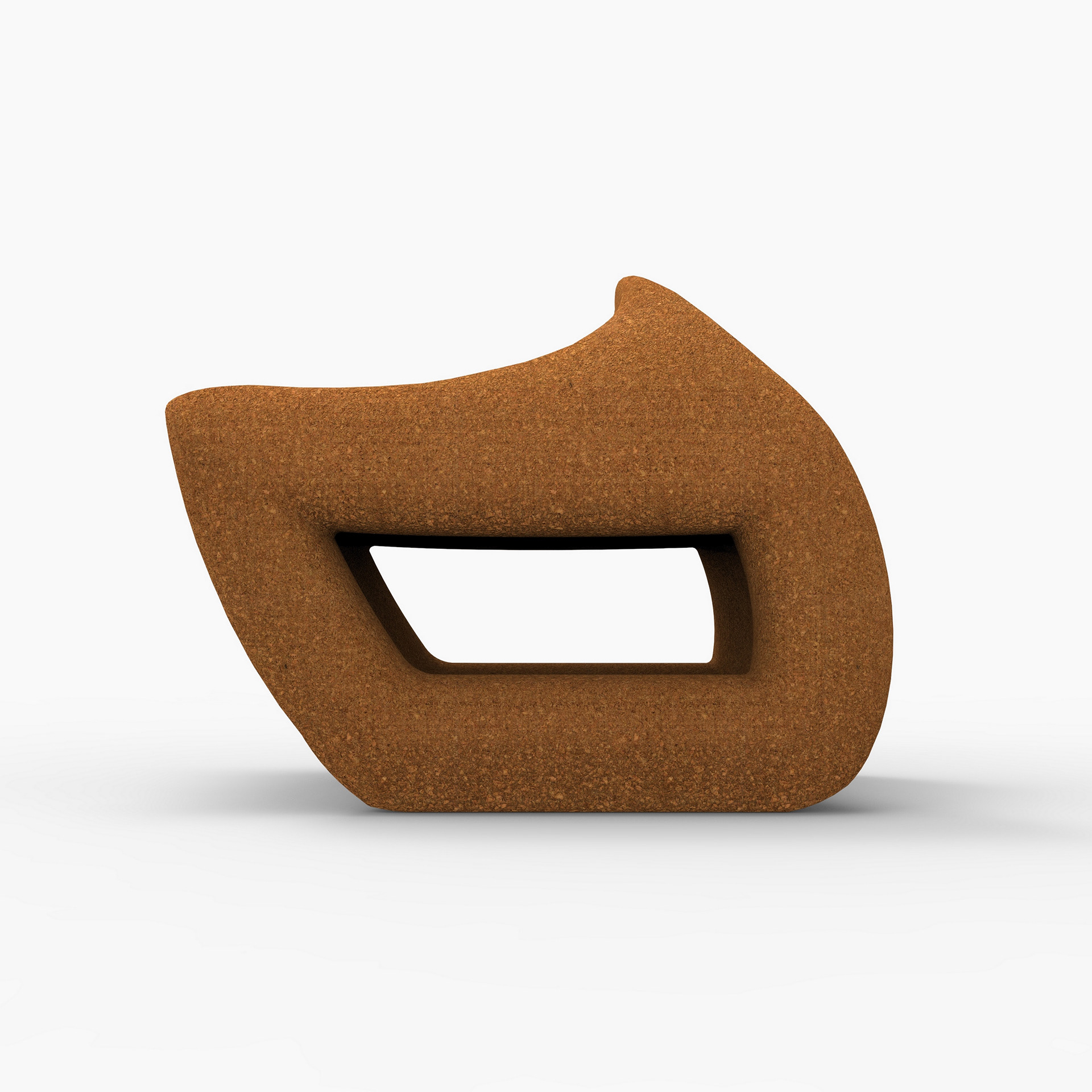 The Spliced Lounge Chair is offered in both wood and cork. In a technique similar to Damien Hirst, I took an elegant form and cross-sectioned it, pulled it apart, and then put it back together!