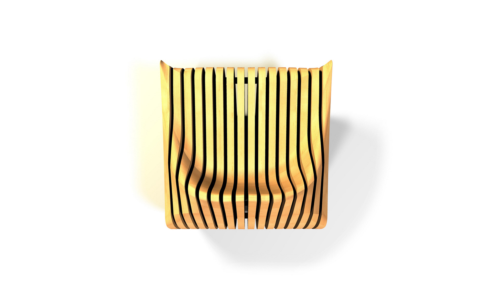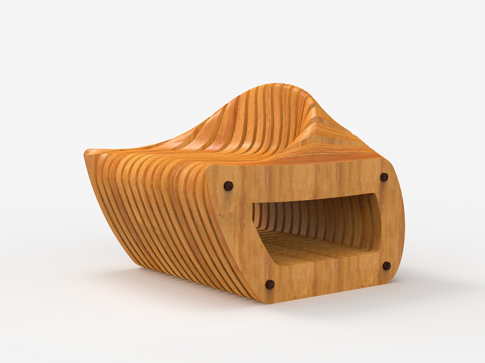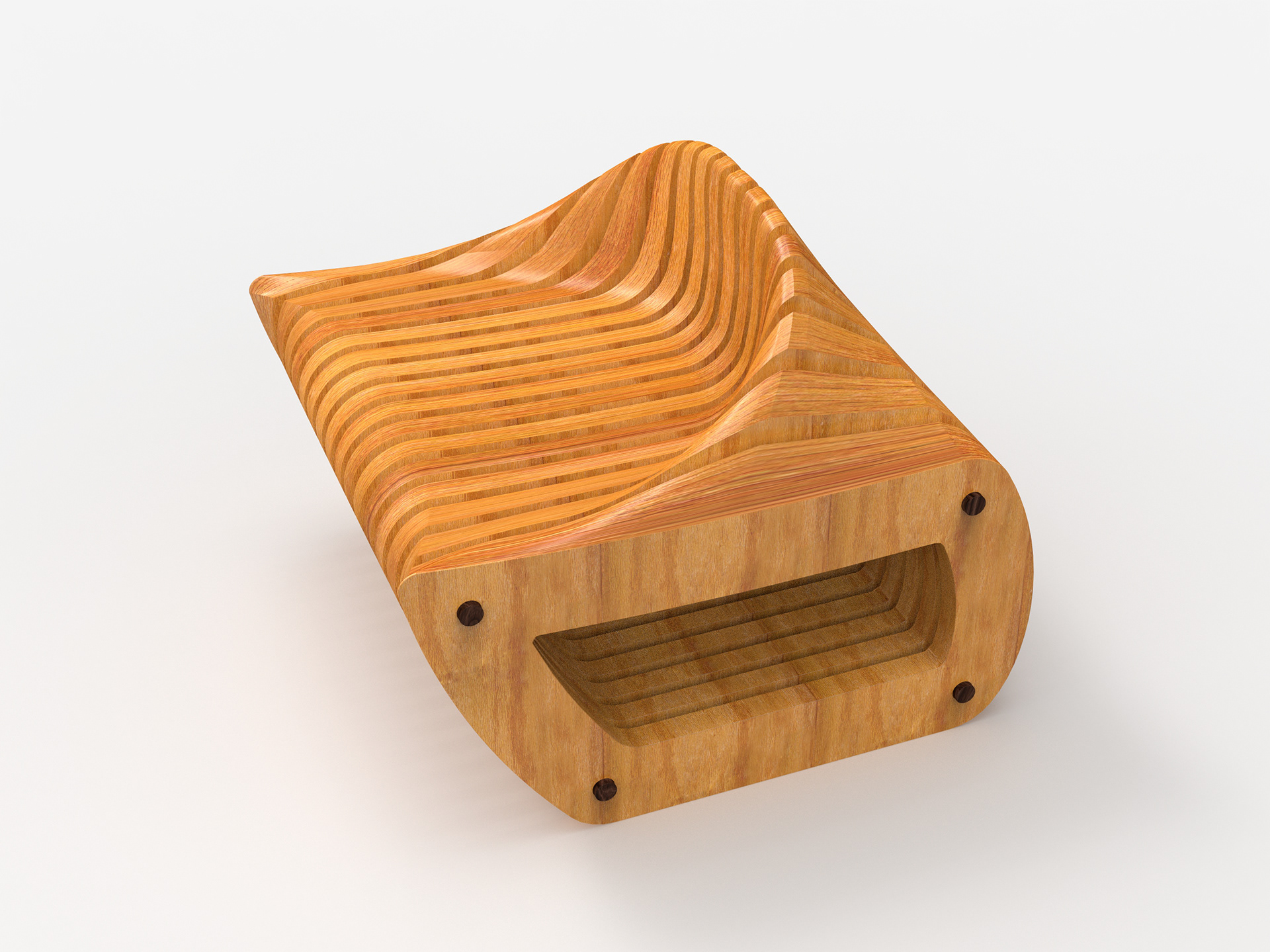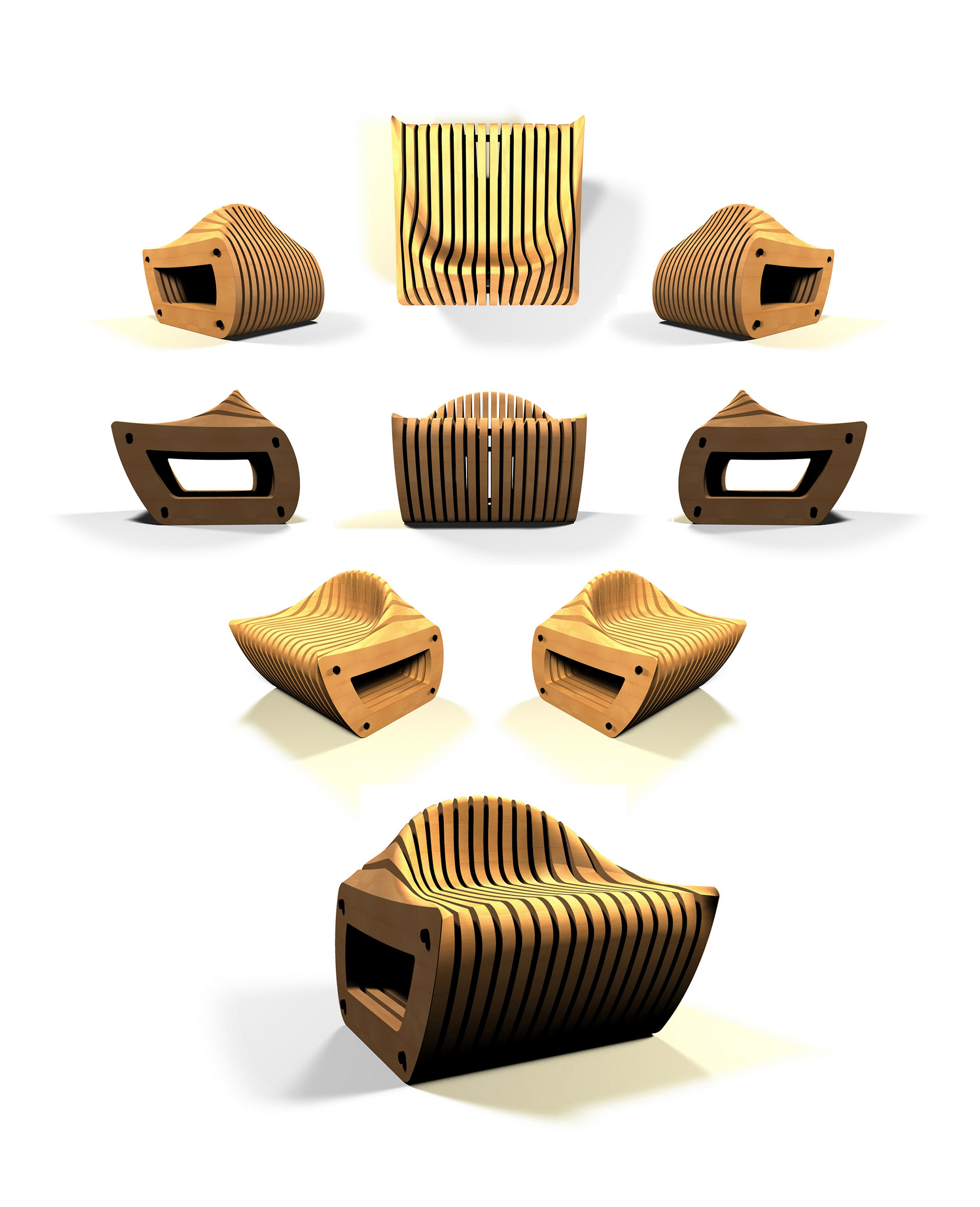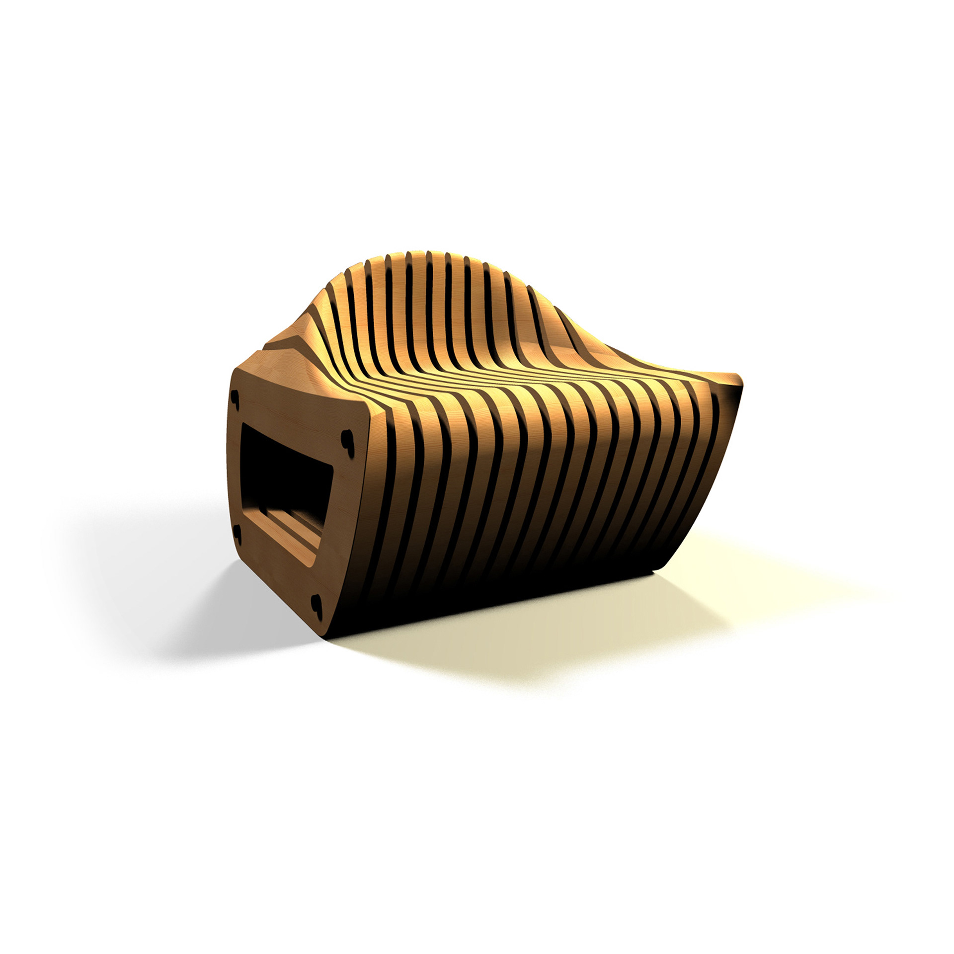 The Spliced Lounge Chair is offered in both wood and cork. In a technique similar to Damien Hirst, I took an elegant form and cross-sectioned it, pulled it apart, and then put it back together!