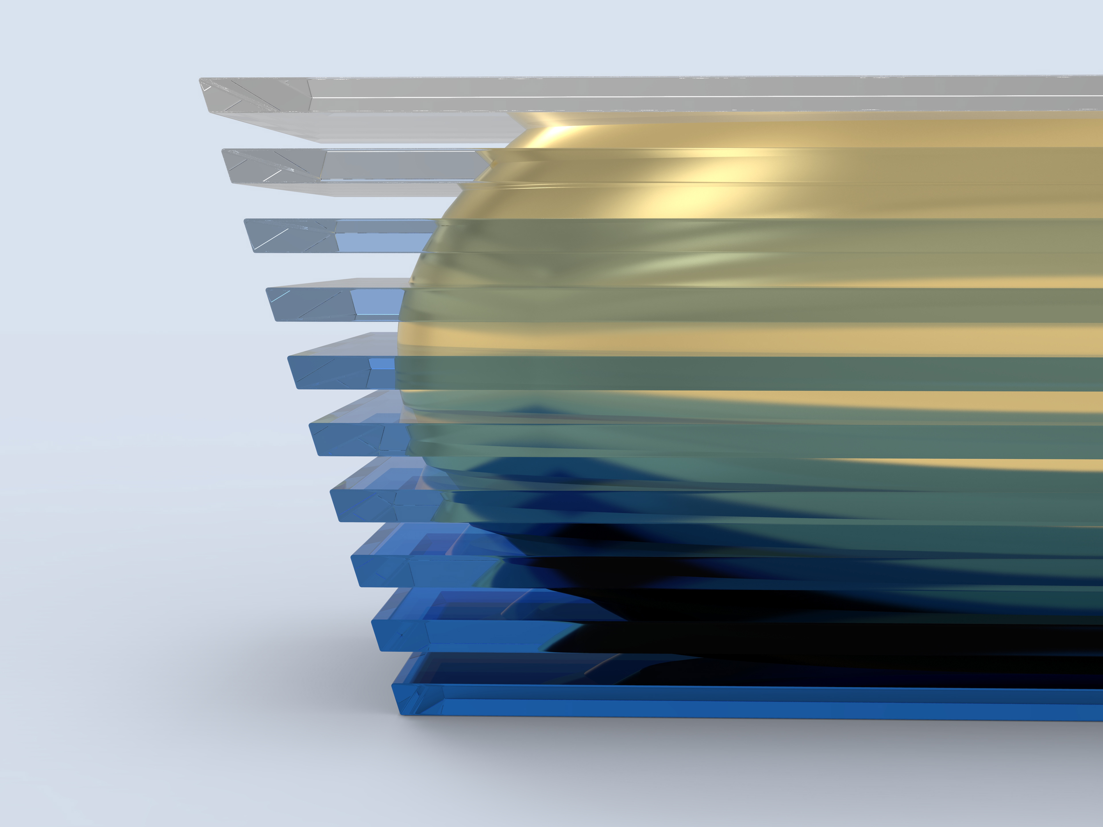 A table that asks the age old question, what happens when the sun sets over the ocean? Does it get absorbed and swallowed by the deep blue sea? Layers of tinted glass sandwich a golden ovoid. The glass goes from deep blue to almost clear, mimicking the sea. 🌈