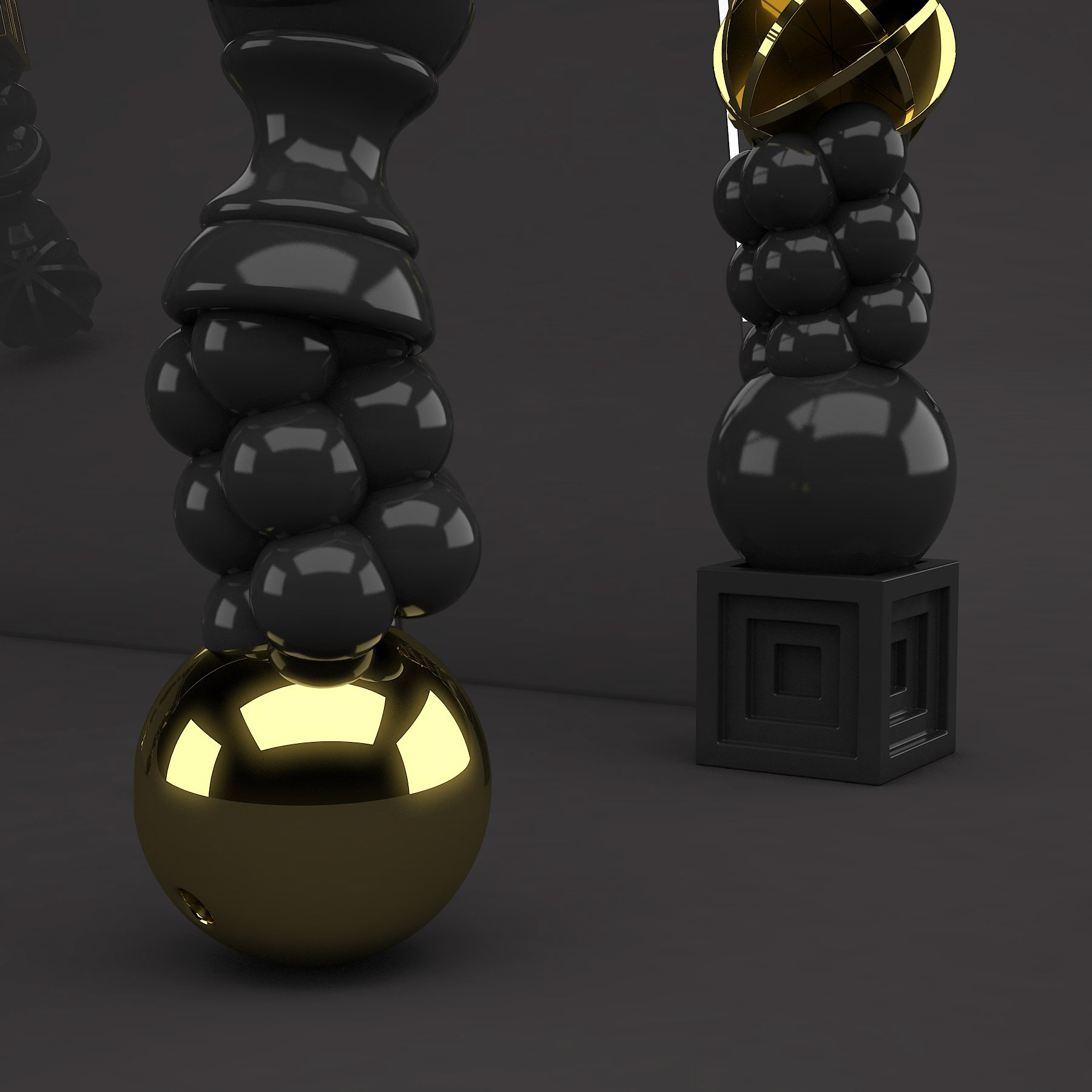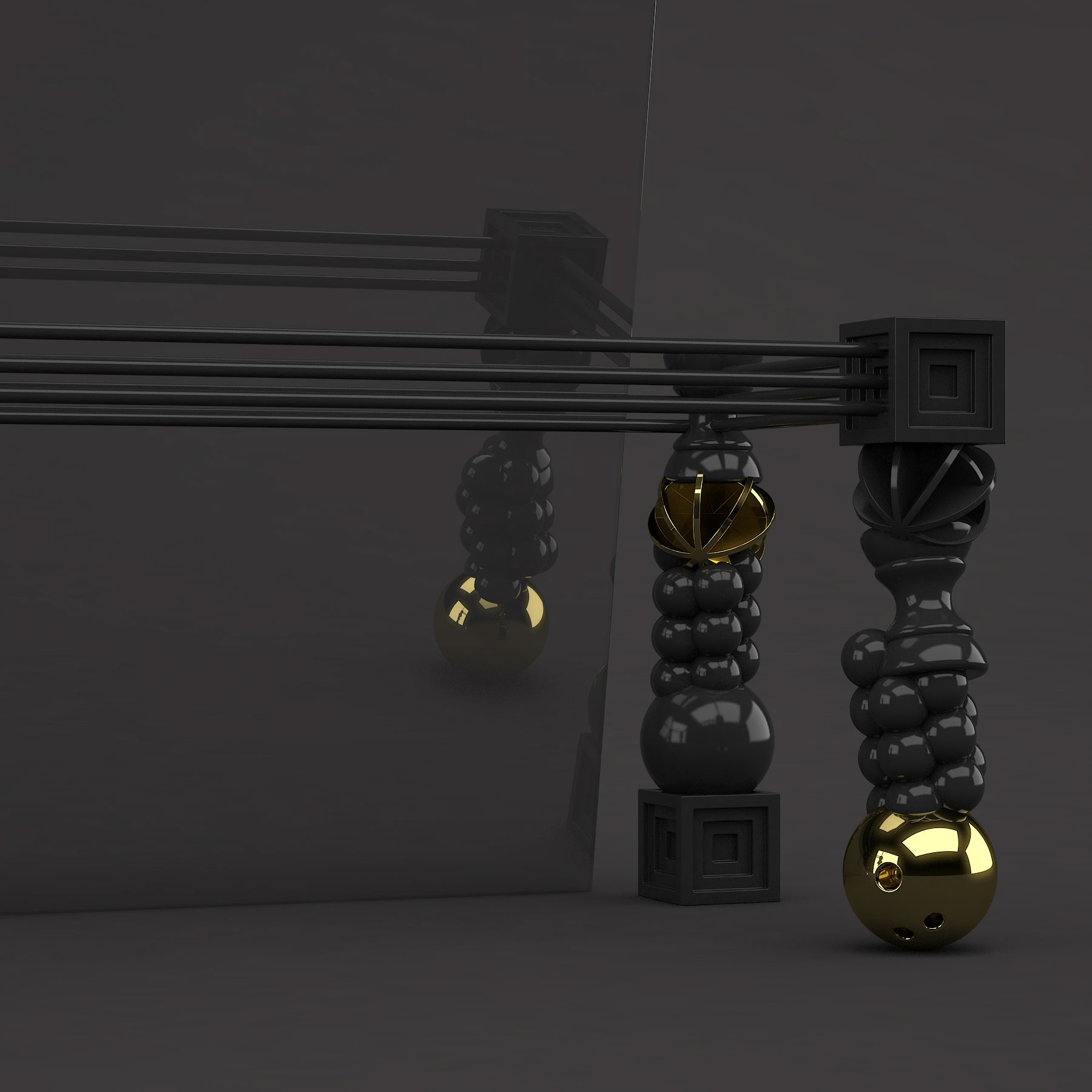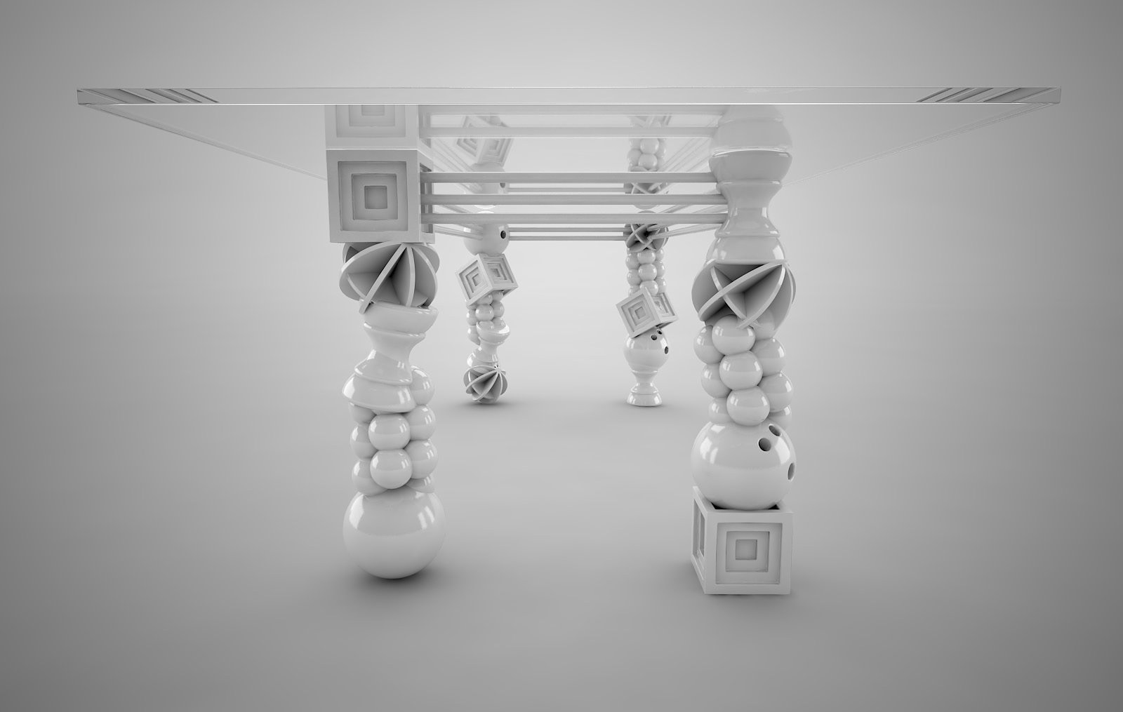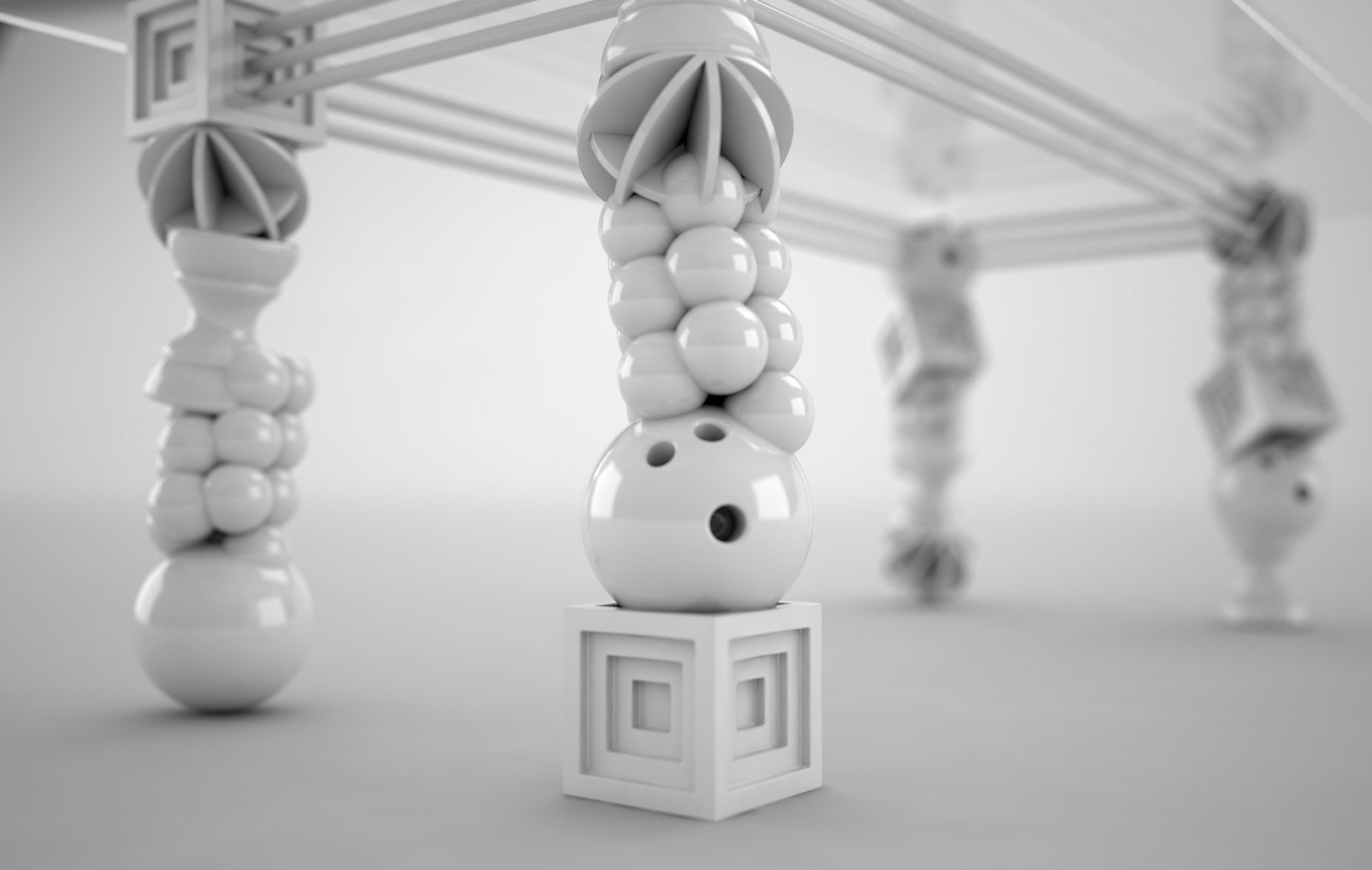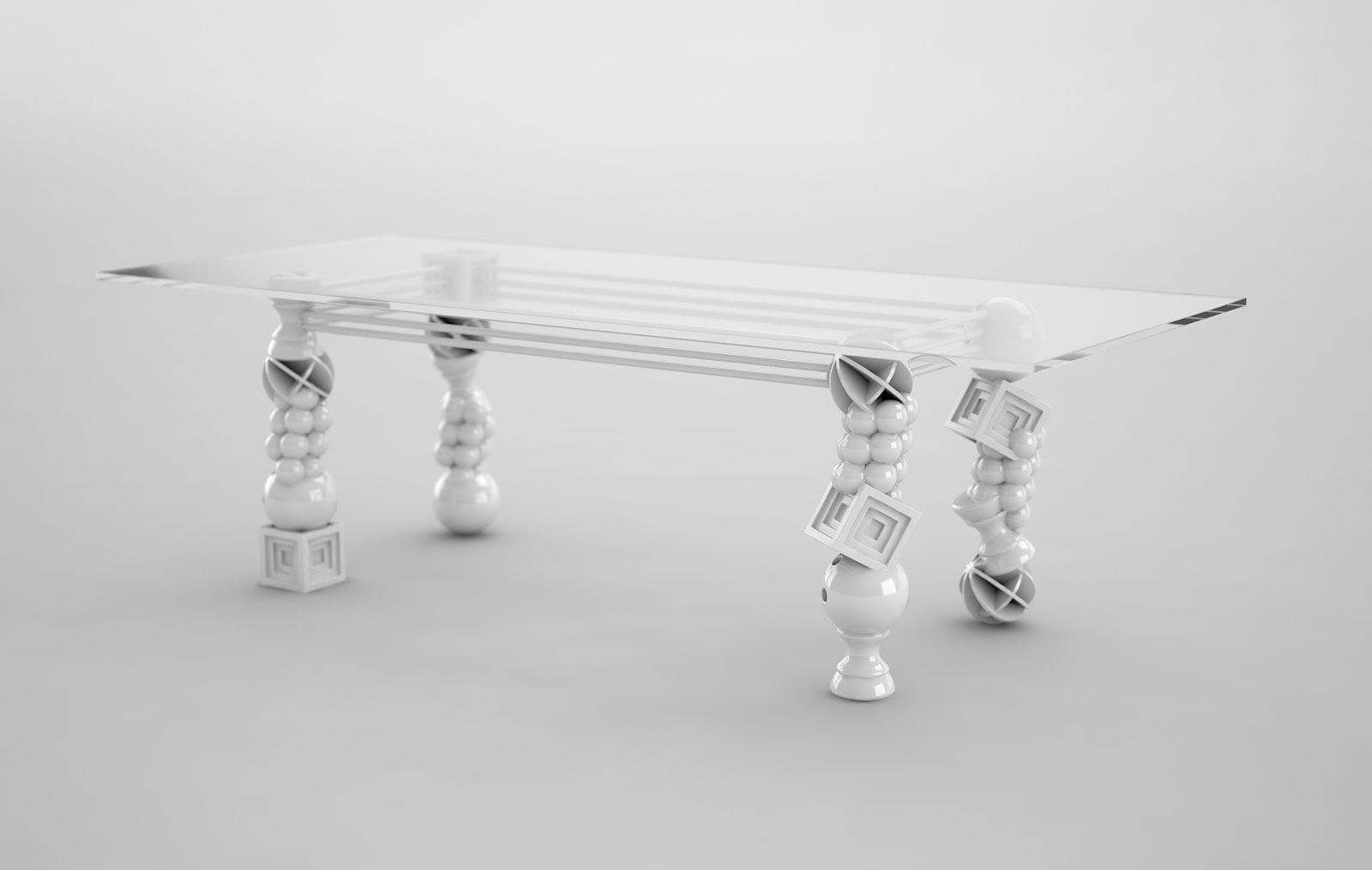 Tackling tackiness. Small toys include gewgaws, knickknacks, baubles, lagniappes, trinkets, and kitsch. No matter how you word it, tchotchkes have a certain stigma attached. What if we could make them an object of desire? That was the goal of this piece. Each form, like the bowling ball, is cast and then reassembled in columns to form four legs of a dining table. The entire piece is finished in glossy white. This gives it a porcelain-like appearance. A juxtaposition of rich polish and ordinary objects equals a true objet d'art. A limited edition black version is available with gold electroplating. Dimensions are 120x48x31"h.